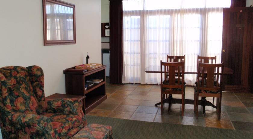 Featuring a King 4-Poster Bed, TV, Desk, Chair and Reading Lamp, Alarm Clock. Bathroom with Corner Spa, Shower, Toilet, Vanity, Hairdryer. Iron and Ironing Board. Open Plan Dining/Living Area, TV/DVD, Double Sofa Bed. Kitchenette with Tea and Coffee making facilities, Microwave, Under-bench Fridge. Second Toilet. Air Conditioning.